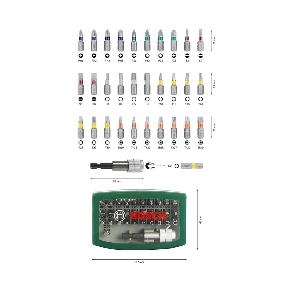 • The 32-piece Screwdriver bit set from Bosch – with external hexagon shank of size 1/4 inch ideal for general screwdriving work with screwdrivers and drills